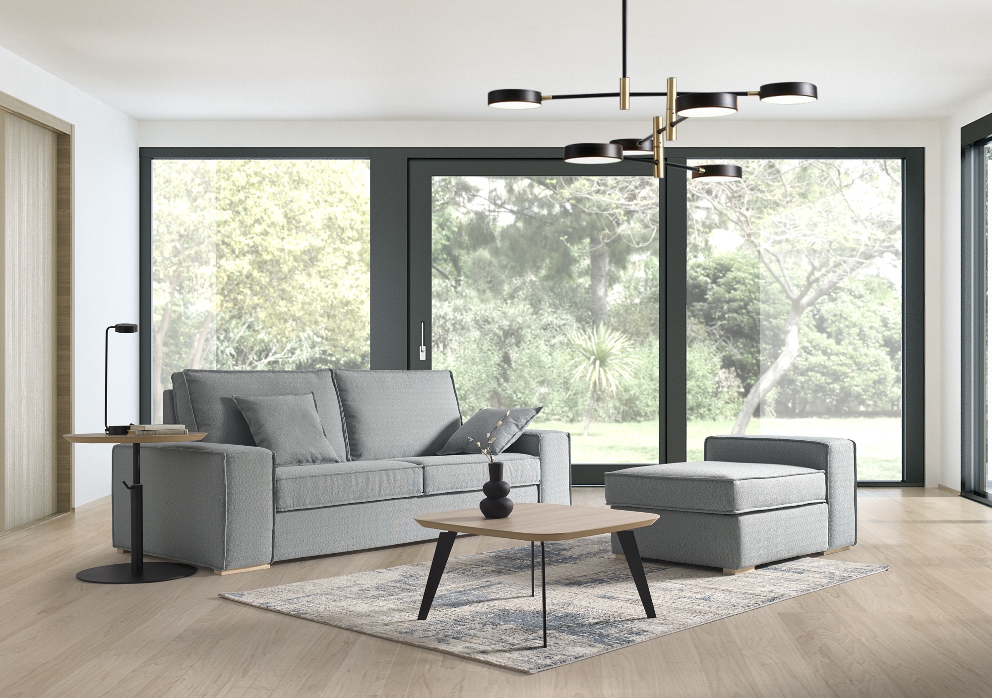 Sofá fijo moderno y cómodo, con diferente modulación, chaise longue, pouff y dos medidas de brazo.