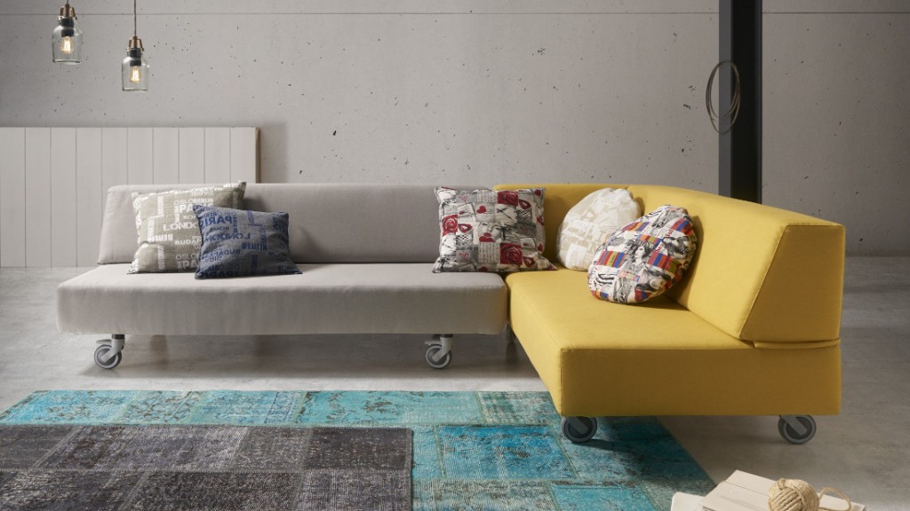 Brio es un sofá modular de dos piezas, una de color gris y otra de color mostaza, con capacidad para cinco personas y que al separarlo se transforma en dos camas. Distintas piezas de espuma de diferentes densidades que descansan sobre un somier metálico, antioxidante y con lamas de madera de haya. Las claves: practicidad y diseño. Descubre más cosas del modelo Brio.