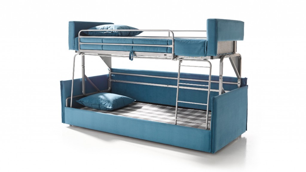 Un sofá que se convierte en una litera. Una estructura de madera de pino y un sistema metálico de acero de alta resistencia. Un sofá cama muy suave y acolchado con asiento, respaldos y colchón de espuma y de color azul cyan. Las claves de este modelo: comodidad y optimización del espacio. Descubre el Coupé Litera.